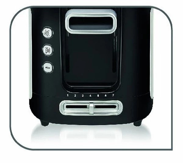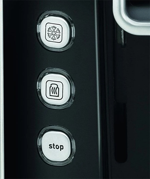 توستر تفال مدل TT3650 به منظور حفظ زیبایی ظاهری، دکمه ها را در قسمت راست دستگاه و به رنگ نقره ای در پس زمینه مشکی تعبیه کرده است. این کار باعث افزایش زیبایی دستگاه شده و دید کاربر را برای کار کردن دستگاه افزایش می دهد. اولین کلید یا دکمه در قسمت بالا که علامت برفک دارد، مربوط به عملیات یخ زدایی نان می باشد. با فشردن آن می توانید نان های فریزری را در عرض یک دقیقه گرم کنید و سپس آن را برشته کنید. دکمه بعدی مربوط به گرم کردن مجدد نان می باشد. این دکمه زمانی کاربردی می شود که نان را قبلا برشته کرده اید و بعد از مدتی سرد شده است. با فشردن این دکمه نان توست شده دوباره گرم خواهد شد.