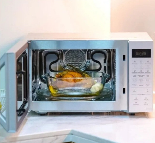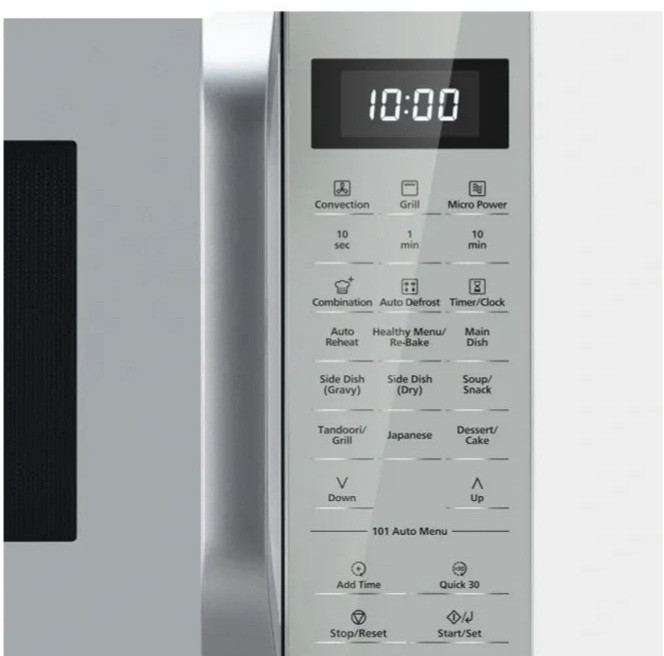 بامایکروویو 27 لیتری پاناسونیک NN-CT65MMKPQ، کارهای آشپزی خود را آسان تر و لذت بخش تر کنید. دارای حالت های همه کاره مانند 2300 وات همرفت، گریل 1350 وات، قدرت مایکروویو 900 وات و سرخ کن هوای سالم است. این فر 4 در 1 می تواند غذا را تا 100 تا 200 درجه در حالت همرفت گرم کند و دارای گزینه یخ زدایی خودکار است که بر اساس وزن کار می کند. علاوه بر این، یک منوی خودکار 101 همه کاره با دکمههایی مانند «منو سالم/پخت مجدد»، «غذای اصلی»، «خدمات کناری»، «دسر» و موارد دیگر دارد.