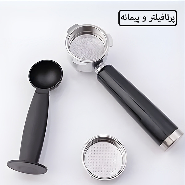 اقلام همراه: تمپرو پیمانه قهوه، یک عدد پرتافیلتر، یک عدد سبد پرتافیلتر تک شات، یک عدد سبد پرتافیلتر دو شات و دفترچه راهنمای انگلیسی و عربی.
