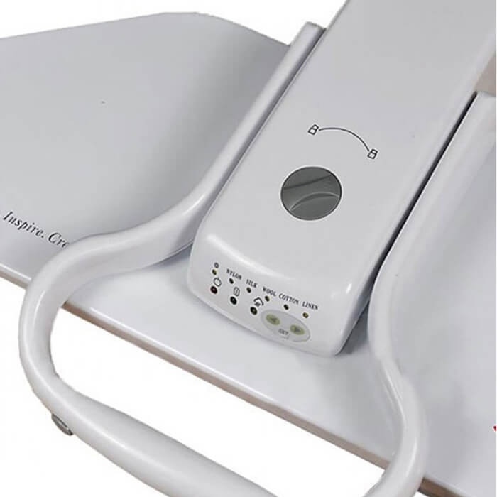 همچنین بر روی دسته اتو پرس، دو عدد دکمه برای بخاردهی به صورت دستی و دکمه ای تعبیه شده که قادر است بخار خروجی پیوسته را فراهم نماید. روی پنل این اتو پرس، دو دکمه وجود دارد که می توانید نوع پارچه مورد نظر را انتخاب نمود.