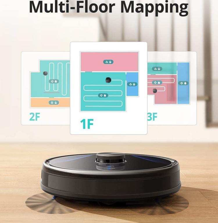 - نقشه برداری چند طبقه: RoboVac می تواند نقشه هایی را برای حداکثر 3 سطح در خانه شما ایجاد کند. همچنین هنگامی که آن را تنظیم کنید، به طور خودکار طبقه ای را که روی آن قرار دارد، تشخیص می دهد. نقشه ذخیره شده شامل چیدمان اتاق و تنظیمات برگزیده سفارشی مانند No-Go Zones است.