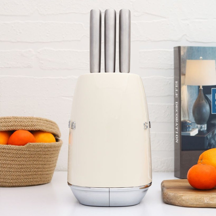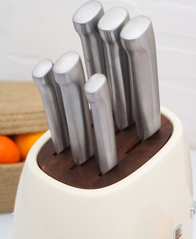 اما تنها ویژگیهای عملکردی ست چاقو اسمگ رنگ کرم نیست که آن را خاص میکند. طراحی منحصربهفرد آن الهامگرفته از سبک رترو دهه 50 میلادی است که در کنار طراحی مدرن، به زیبایی چشمنوازی تبدیل شده است.