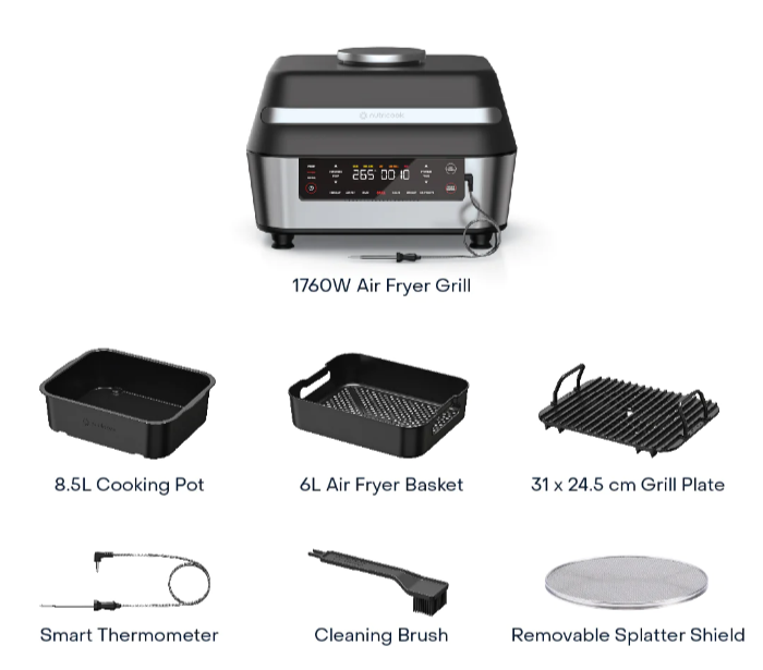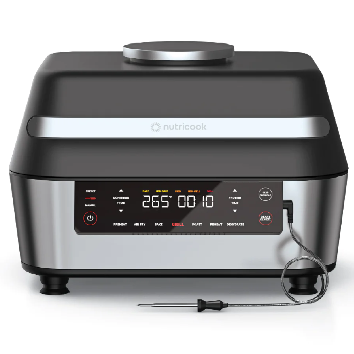 گریل نوتریکوک مدل AFG960 دستگاه باکیفیت، قدرتمند و هوشمند 1760 واتی است که با 6 برنامه طبخ، پخت 5 نوع مواد غذایی پروتئینی، دماسنج هوشمند، 5 سطح درجه حرارت و ظرف پخت 8.5 لیتری، سرخ کردن و کباب کردن غذاها در فضای باز را شبیه سازی کرده و این امکان را فراهم کرده به راحتی و سریع از غذاهای کبابی سالم و خوشمزه لذت ببرید.
