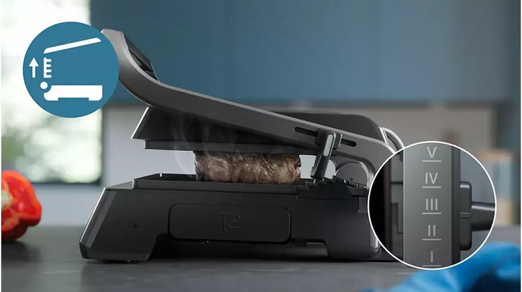 صفحه بالایی این گریل بسته به غذایی که درست می کنید در 5 زاویه قابل باز شدن است و تا زاویه 180 درجه نیز به طور کامل باز می شود. برای تنظیم ارتفاع در کنار بدنه دکمه ای طراحی شده که می توانید برای غذاهای ضخیم تر، پیتزا و ساندویچ های روباز به راحتی ارتفاع صفحه گریل بالایی را بیشتر کنید.