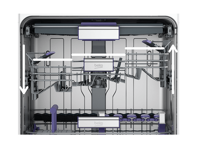 قسمت داخلی ظرفشویی بکو دارای طراحی ویژهای است. ماشین ظرفشویی 15 نفره بکو مدل 28424 x چندین سبد مجزا برای انواع ظروف در نظر گرفته است و برای ایجاد فضای باز بیشتر سعی کرده است تا از دو تکنولوژی سبد متحرک و سبد چرخشی استفاده کند.