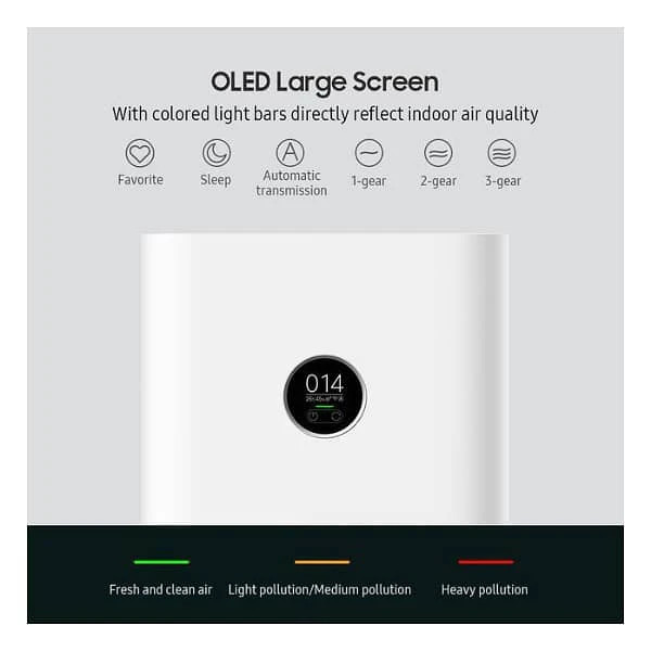 صفحه نمایش OLED به صورت جامع، میزان تغییرات کیفیت هوا که به صورت لحظه ای با سنسور PM2.5/PM10 اندازه گیری میشه رو نمایش میده. در حالت خودکار، این دستگاه تصفیه هوا با AI (هوش مصنوعی) کیفیت هوا را در زمان واقعی کنترل می کنه و به طور خودکار سرعت تصفیه را تنظیم می کنه.