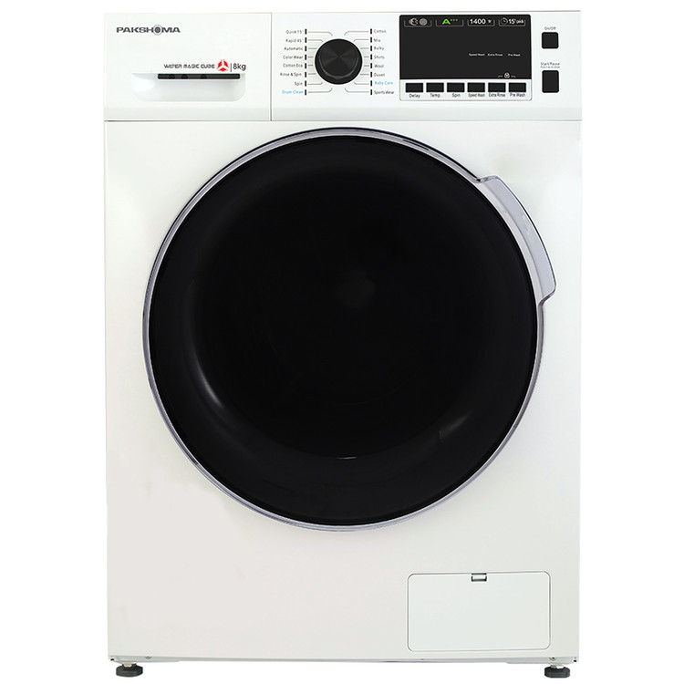 ماشین لباسشویی پاکشوما BWF-40801 WT نوع درب از جلو و در رنگ سفید تولید شده است.