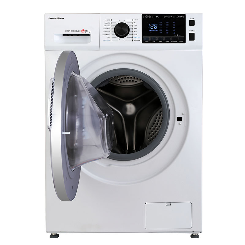 ماشین لباسشویی پاکشوما BWF-40801 WT نوع درب از جلو و در رنگ سفید تولید شده است.