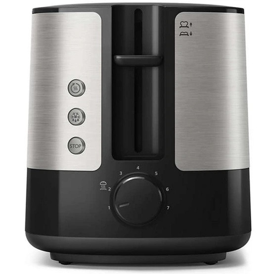 سیم برقی که برای این توستر در نظر گرفته شده 85 سانتی متر است که در مقایسه با توستر های دیگر طول سیم بلندتری به حساب آمده و امکان قراردادن آن را در فواصل دور تر از پریز برق ممکن می کند. توستر PHILIPS دارای دو درگاه نان بوده و دو قطعه نان را می تواند برای شما برشته کند. سیستم کنترل در این محصول به صورت دکمه ای و چرخشی طراحی شده که باعث سهولت استفاده برای شما شده و شکل بصری توستالژیک و زیبایی برای محیط شما بوجود می آورد. جنس بدنه در این توستر از استیل ضد زنگ انتخاب شده که استحکام مناسبی برای استفاده طولانی مدت در اختیار شما قرار دهد.