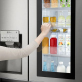 یخچال InstaView Door-in-Door ™ یک پنل شیشهای آینه مانند دارد که در حالت عادی تاریک است و البته مانند آینه میتوانید خود را در صفحه بیینید. با زدن دو ضربه پشت سر هم، صفحه شیشهای روشن میشود و به شما اجازه میدهد تا محتویات پشت شیشه را مشاهده کنید.
