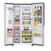 قابلیت اینستاویو موجود در یخچال 34 فوت ال جی X348 که امکان دسترسی و مشاهده هوم بار را فراهم می نماید. درب اینستاویو این امکان را برای کاربران می دهد که بدون نیاز به باز کردن درب اصلی یخچال X348 LG ، مواد خوراکی و نوشیدنی های دلخواه خود را در دسترس داشته باشید. به طور معمول این قسمت برای دسترسی به مواد پرمصرف مورد استفاده قرار می گیرد تا از اتلاف انرژی پیشگیری شود. بدنهی یخچال ساید X348 ال جی از استیل ضد زنگ و ضد ضربه ساخته شده تا علاوه بر زیبایی طول عمر مفید دستگاه افزایش یابد .رنگ های جذاب یخچال X348 چیدمان منزل شما زینت میبخشد. بر روی درب چپ یخچال ساید بای ساید X348 الجی یک صفحه نمایش LED تعبیه شده است که دارای گزینههای مثل یخ ریز و آب ریز ، LIGHT , Hygiene fresh, water filter , Lock, ست که امکان تنظیمات ساده یخچال را در دسترس قرار میدهد. برای باز و بسته کردن درب یخچال اینستاویو ال جی X348 از دستگیرهها توکار و مخفی استفاده شده است. یخچال 34 فوت X348 ال جی از قفسه و کشوهای کاربردی مانند fresh zone وRack Bottle و utility Box تشکیل شده است که هر کدام دمای مخصوص به خود را دارند و برای نگهداری مواد غذایی، سبزیجات و میوه مواد خشک و … مورد استفاده قرار میگیرند. از دیگر قابلیت های هوشمند یخچال ساید بای ساید ال جی X348 میتوان به موارد زیر اشاره نمود.