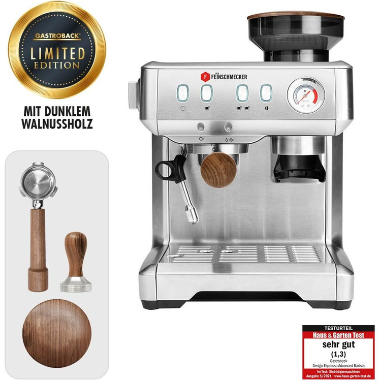اسپرسوساز با آسیاب با چوب گردو گاستروبک 42624 با طراحی شیک و نقره ای رنگ خود به زیبایی در آشپزخانه شما می درخشد و جلوه ای لوکس به آن می دهد. شرکت گاستروبک برای قسمت های دسته پورتافیلتر، تامپر و درب آسیاب از چوب گردو مرغوب و ظریف استفاده کرده که به نوعی طراحی خلاقانه محصول نیز محسوب می شود.