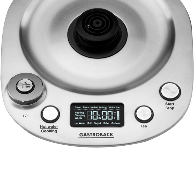 کتری بر روی یگ پنل قرار می گیرد. این پنل دیجیتالی بوده و مجهز به یک نمایشگر است. وضعیت دستگاه را می توانید از طریق این صفحه نمایش مشاهده و تنظیمات مربوط به چای ساز حرفه ای گاستروبک 42438 را وارد کنید. ارقام و حروف به شکل دیجیتالی با خوانایی بسیار بالا نمایش داده می شوند. از طریق دکمه های فشاری و ولومی می توانید برنامه های مختلف را انتخاب یا دمای و زمان مورد نظر را وارد کنید. دستگاه دمنوش ساز برقی گاستروبک قادر به تنظیم دقیق دما است مثلاً می توانید دمای آب را در 80 درجه تنظیم کنید بدون آنکه بالاتر یا پایین تر بیاید.