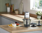 ظرف کار شیشه ای با کیفیت بالا با حجم کاری 0.6 لیتر نیز برای مقادیر بیشتر ایده آل است و به لطف اتصال Dripper Pro، همچنین اجازه می دهد تا مایعات در طول پردازش اضافه شود.کفی بدون لغزش برای ثابت نگه داشتن کاسه روی میز کار، حلقه کابل برای نگهداری منظم کاسه پس از استفاده و مینی باکس و سیستم ایمنی دارا می باشد.این خردکن را می توان از هم جدا کرد تا به راحتی تمیز شود. کاسه را می توان پس از تهیه سس های خوش طعم، سالاد و غیره در ماشین ظرفشویی قرار داد
