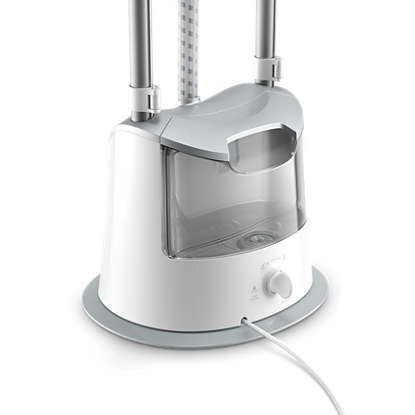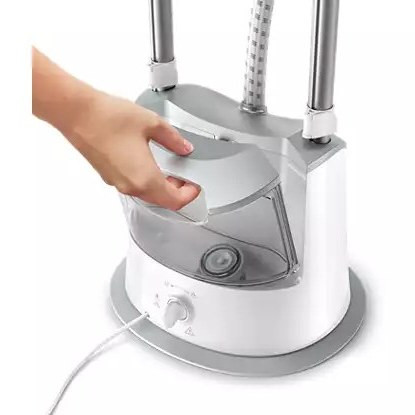 بخارگر ایستاده فیلیپس مدل GC487 به رنگ سفید خاکستری، طراحی منحصر به فرد و ویژه ای دارد. این محصول شامل سری اتو، یک میز یا تخته، دو میله قابل تنظیم به همراه دستگاه اصلی و مخزن آب در قسمت پایین می باشد.
