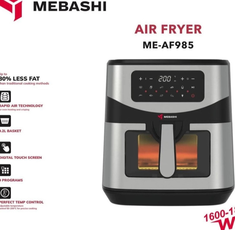 قسمت جلوی بدنه mebashi ME-AF985 صفحه نمایشگر با دکمه های لمسی جهت انتخاب پارامترهای سرخ کردن و طبخ غذا تعبیه شده که کار با آن ها بسیار ساده است. قطعات سرخ کن قابل جدا شدن و شستشو بدون زحمت در ماشین ظرفشویی هستند.